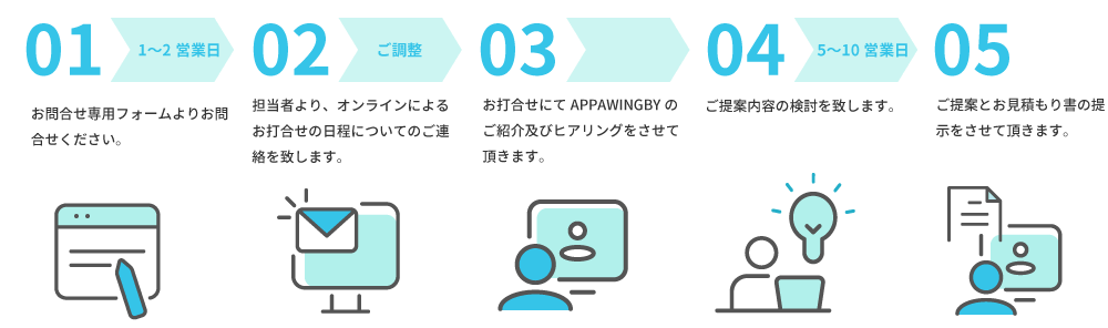 APPSWINGBYでは、常にお客様の側に立ち、開発プロジェクトを進めます。また、コスト削減やサービス品質向上を実現可能な新しいテクノロジーやクラウドサービスについても積極的に、わかりやすく提案致します。