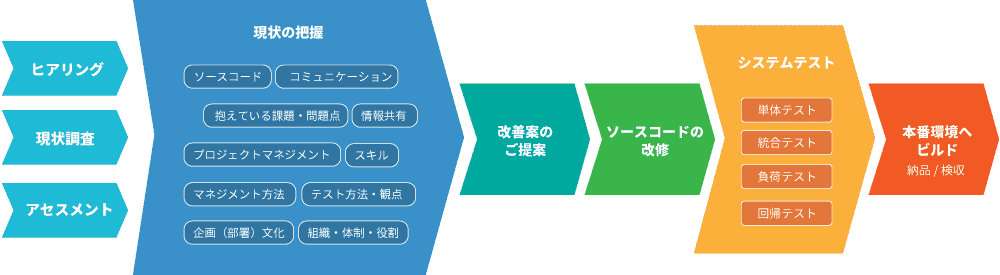 過去の技術を引き継ぎ、アップデートが行われていないシステムの場合には、最新の開発技術、言語、手法、改善案等についても支援を行います。
